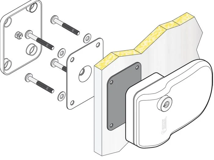 Fissaggio a parete con 4 viti passanti. Completa di contropiastra e copertura interna.