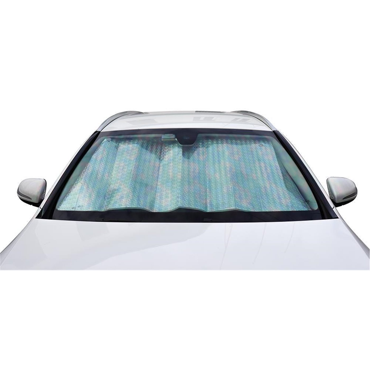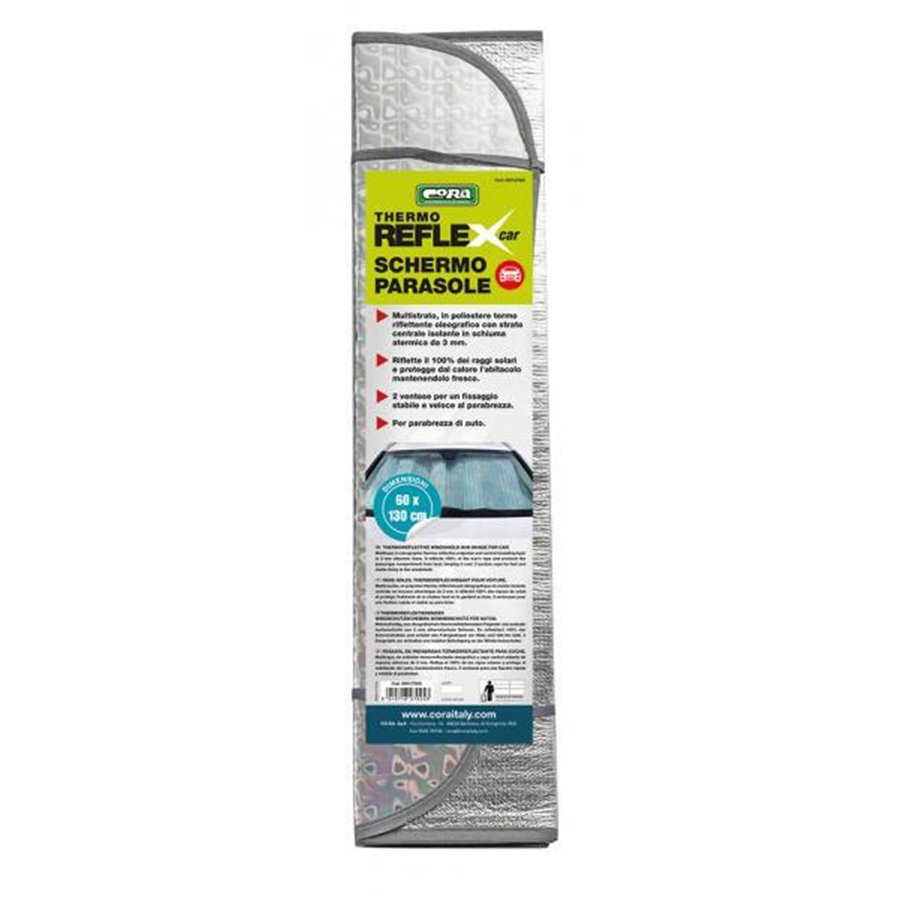 Schermo parasole termico anteriore per parabrezza. Multistrato: in poliestere termo riflettente oleografico con strato centrale isolante in schiuma atermica da 3 mm. Riflette il 100% dei raggi solari e protegge dal calore l’abitacolo mantenendolo fresco. 2 ventose per un fissaggio stabile e veloce al parabrezza. Dimensioni: 130x60 cm.